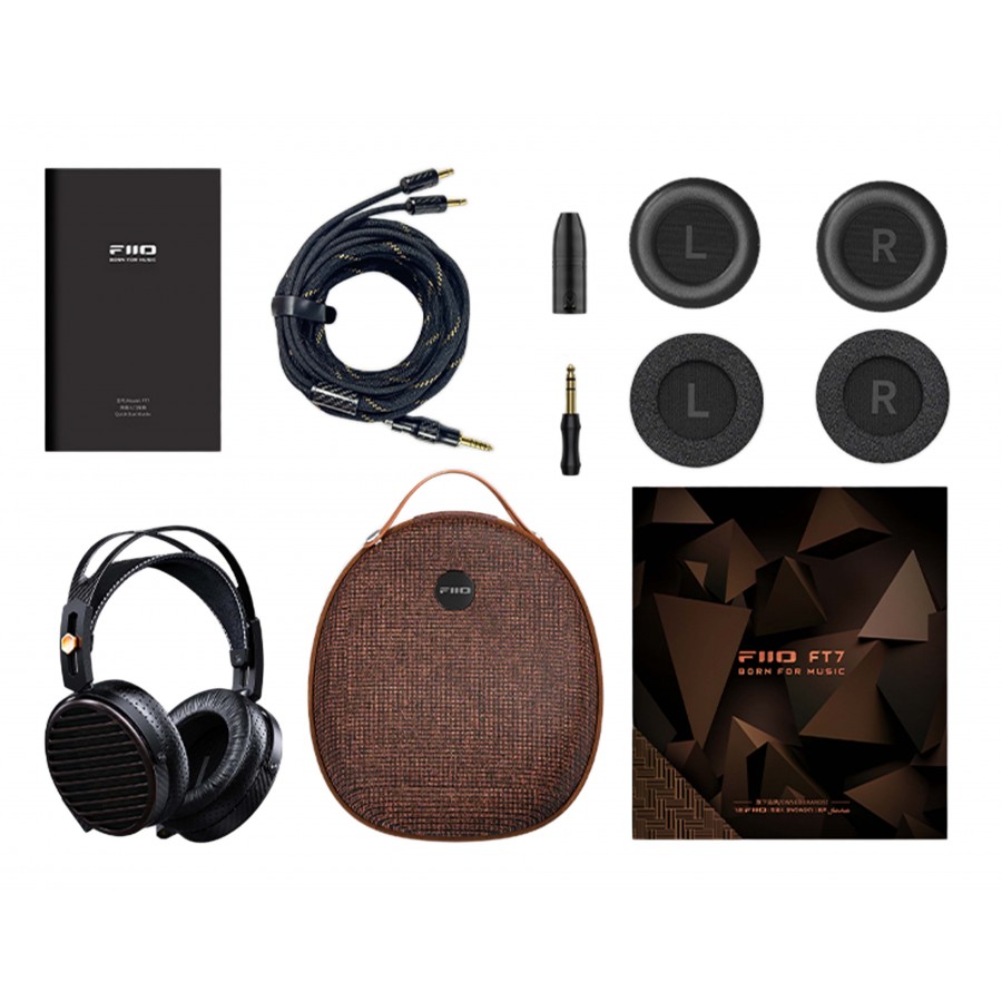 | Package contents | 1x FiiO FT7 1x Detachable cable 2x 3.5mm jack to 4.4mm termination 1x 4.4mm to 6.35mm jack adapter 1x 4.4mm to 4-pin XLR adapter 1x Leather earpads pair 1x Storage pouch |
