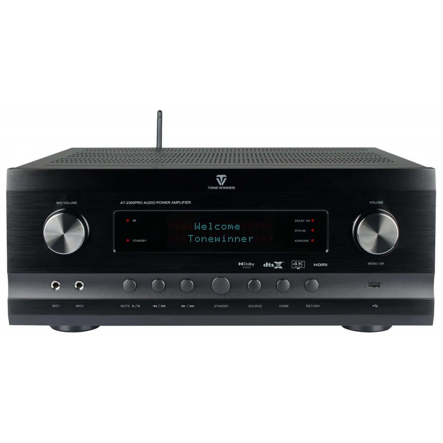 The Tonewinner AT-2300PRO is a audio-video processor and home theater amplifier high-end device featuring powerful multichannel amplification and a complete audio-video processing section dedicated to immersive installations. Designed around a 7-channel amplification architecture with an extensive preamplification section (configuration up to 5.3.2/11.3), it integrates amplification capable of delivering up to 230W under 8 ohms for the 3 front channels and 120W under 8Ω for the other channels, relying on a robust power supply and Hi-Fi circuitry ensuring stability and dynamics. Compatible with 3D audio formats Dolby Atmos, Dolby TrueHD, DTS:X and DTS-HD, it also supports modern video standards such as 4K, HDR10, Dolby Vision, HLG and 3D, with full HDMI signal management (HDMI 2.1, ARC, CEC, HDCP2.2).