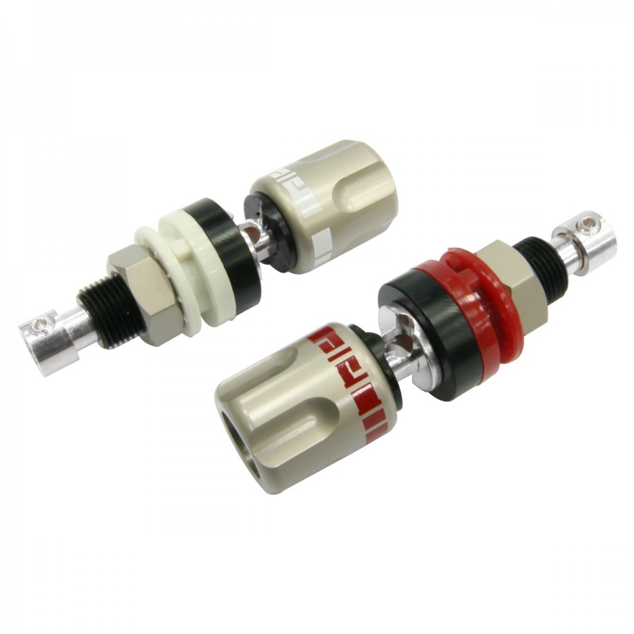 These aeco ABI-0611R speaker terminals offer excellent design quality. They use low-mass contacts made of high-purity tellurium copper with rhodium plating, ensuring both excellent conductivity and resistance to oxidation. The body of the terminal blocks is meticulously machined from a single piece of polyoxymethylene (POM) using CNC (numerical control). An internal cable is simply fitted using a screw system. These terminal blocks also accept bare wires (Ø4mm max), banana plugs and forks (Ø6/8mm).