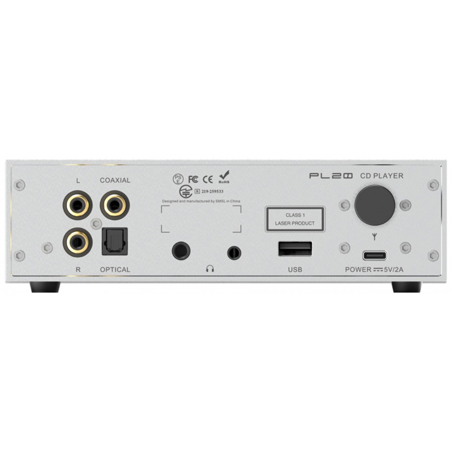 The SMSL PL20 is positioned as a versatile CD player combining a dual CS43131 DAC architecture with a built-in ripper function, while ensuring SACD compatibility for high-resolution formats. This technical foundation is accompanied by extensive connectivity, from bidirectional Bluetooth to USB playback of DSD64 files, complemented by two dedicated headphone outputs in single-ended 3.5mm and balanced 4.4mm jacks. The unit can therefore be used with both physical media and digital sources, with the option of switching to an external DAC thanks to the optical and coaxial outputs.