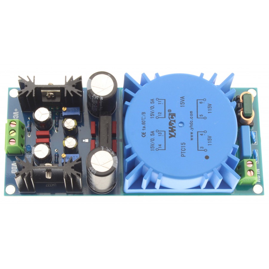 This symmetrical regulated DC linear power supply module with dual LM337 negative and LM317 positive regulators is designed to cleanly power any DC circuit from 1.25V to 18V output at 0.5A (LM317 current).