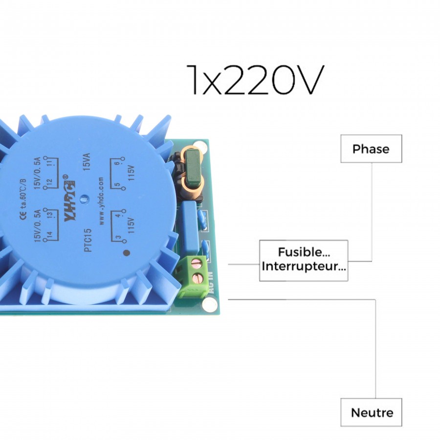 Fitted as standard with a 230V 15 VA moulded transformer mounted on the printed circuit board, installation is simple. It features two screw potentiometers (one per regulator) for voltage adjustment from 1.25 to 18V DC using a simple flathead screwdriver.