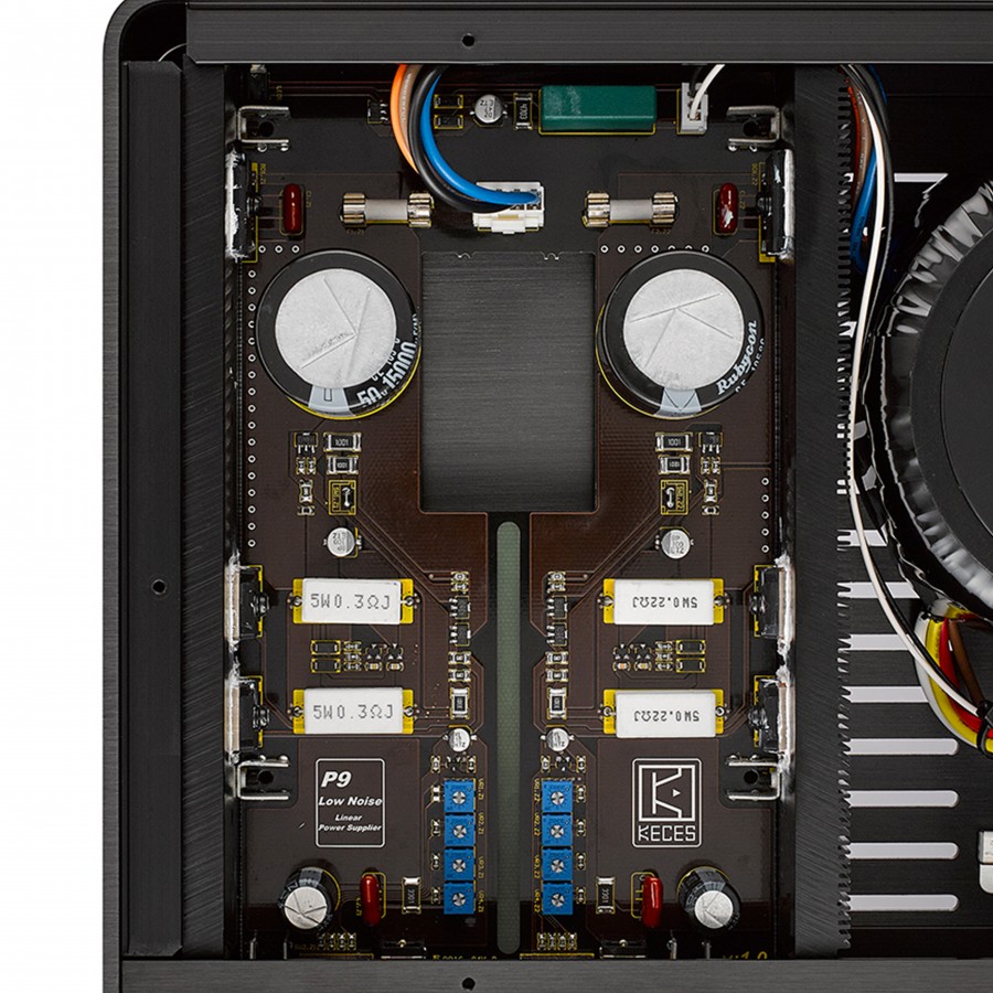 The Keces P9 Dual is a low-noise regulated linear power supply, a direct successor to the P8, designed to provide stable, clean power to sensitive audio components. It delivers up to 5A per rail, with a peak capacity of 7A, utilising an in-house developed toroidal transformer, whose precise winding and carefully selected materials stabilise the voltage whilst limiting electrical interference upstream of the circuit power supply.