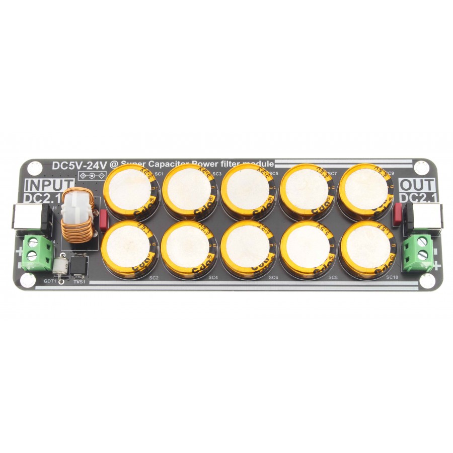 This ultracapacitor power filter module enables you to supply a clean 5-24V DC current to power your devices, and supports a maximum current rating of 10A. It is made up of no less than 10 high-quality WIMA supercapacitors. This power filter reduces potential interference and noise from your power system. This power filter is ideal for powering a Rapsberry PI, digital interface, NAS, router and more. The module features gold-plated DC5.5/2.1mm input and output connectors, as well as screw terminals with copper contacts for simplified connection when required.