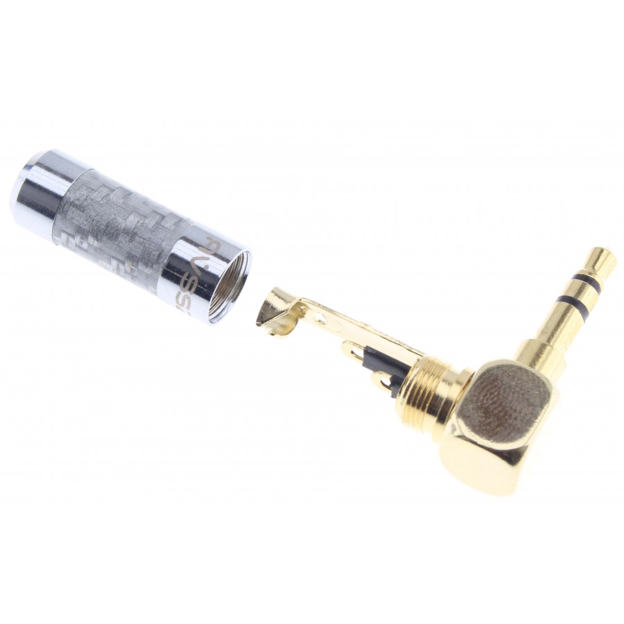 This angled 3.5mm TRS male jack connector features 24k gold-plated contacts as well as a carbon fiber body. This allows it to resist oxidation and corrosion while also protecting against interference.