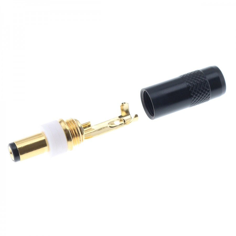 This DC 5.5/2.5mm Elecaudio DCT-2.5G connector will allow you to design high quality power cables, ensuring a clean transmission of the electrical signal to your HiFi device. This cable uses high purity Tellurium copper contacts, with Direct Gold plating, i.e. gold plating without Nickel underlay. The connector is covered by a robust black aluminum shell.