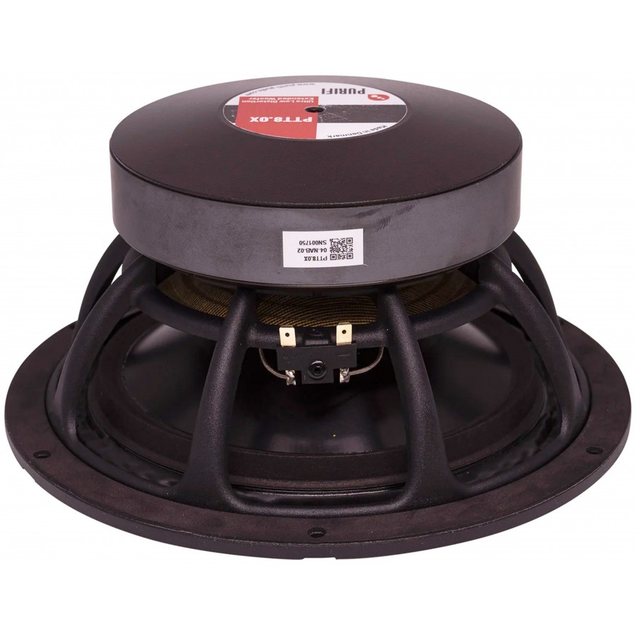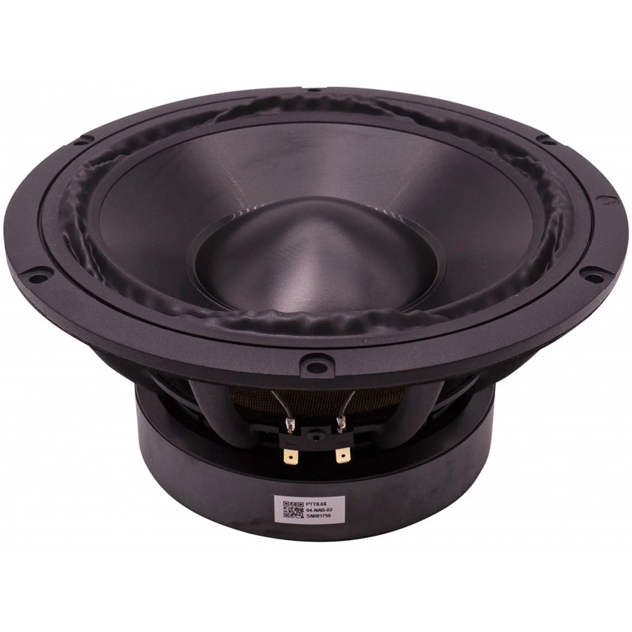 The Purifi PTT8.0X04-NAB-02 is a 20.32 cm (8") speaker with a nominal impedance of 4Ω, designed to reproduce mid-range frequencies while maintaining usable extension in the bass and treble ranges. With its 350W power handling capacity and extremely low distortion level, even at full power, the PTT8.0X04-NAB-02 is the ideal choice of full-range loudspeaker for any Hi-Fi installation.