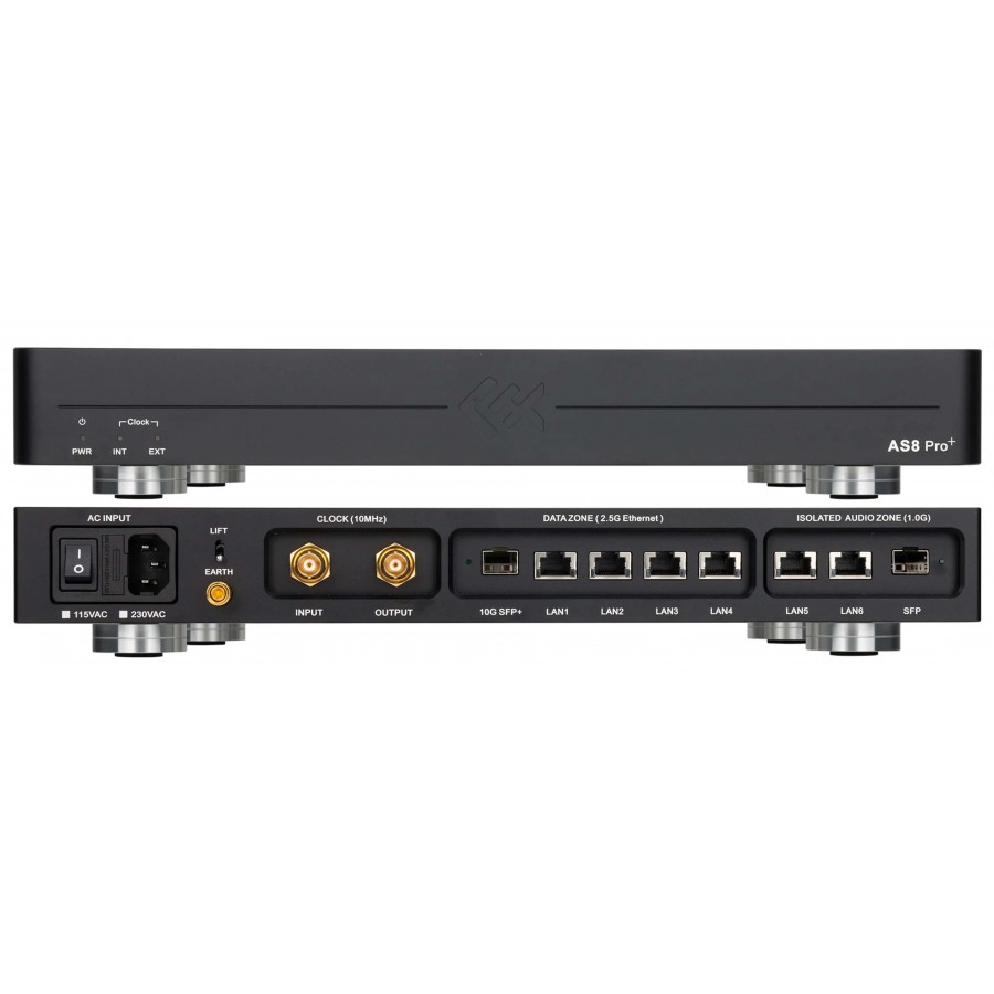 LHY Audio offers us their AS8 Pro+ network switch. It features 6 RJ45 Ethernet ports and 2 SFP fiber optic ports, as well as a dedicated input and output connected to its built-in 10MHz OCXO SC-CUT clock. Everything is housed in an elegant CNC-machined anodized aluminum chassis designed to minimize resonance and engineered to physically separate data processing, audio signal processing, internal clock circuitry, and the power supply stage.