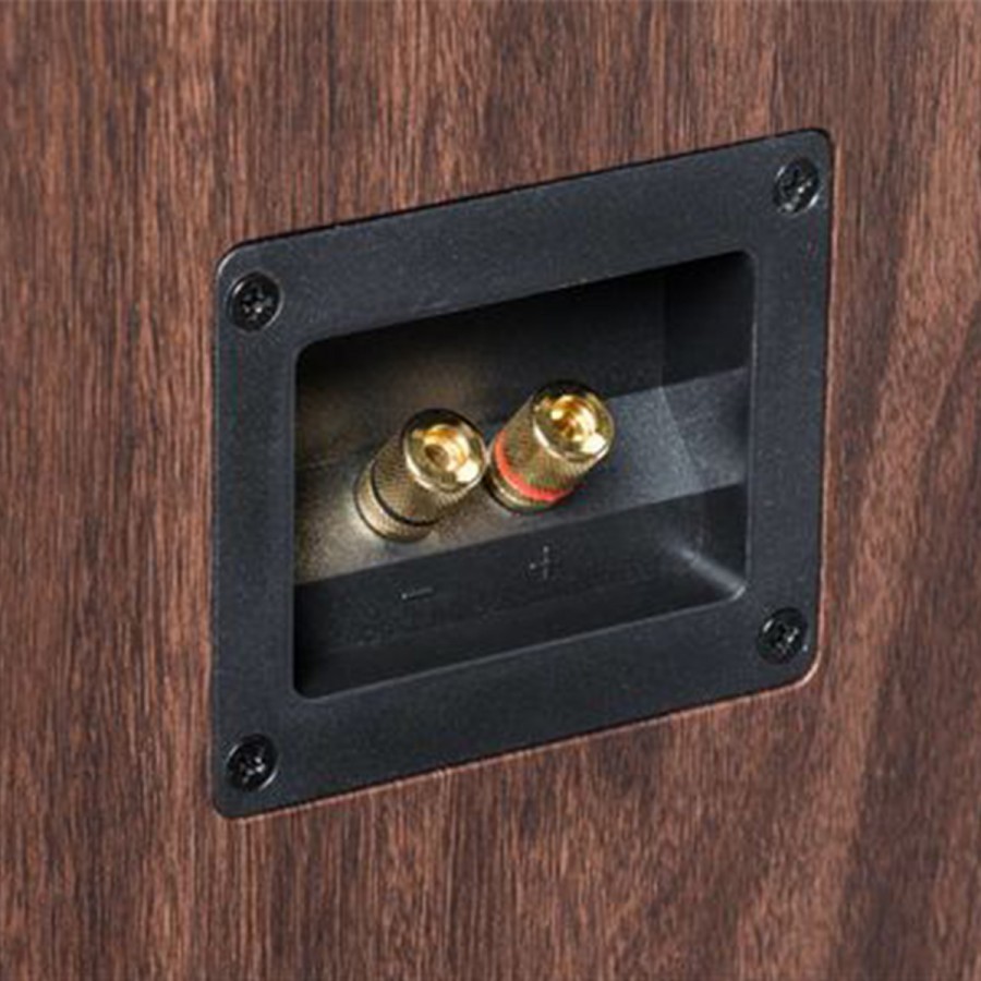 The Eltax Monitor MTR 1959 adopts a robust cabinetry with its reinforced MDF cases recalling in an elegant way the aesthetics of the 70s. Its dimensions of 38cm wide and 60cm high make them relatively compact speakers and facilitate their integration into any type of interior. Technically, many internal reinforcements will also be found to limit and remove harmful vibrations. In addition, the inclined supports of the speakers optimize the phase and the perception of the different frequencies. The vent leading to the front of the enclosure supporting the bass-reflex reduces the necessary spacing of the enclosures with a rear wall and facilitates their placement in a room. Finally, heavy section cables, banana plugs and forks are compatible with the screw terminals of the Eltax Monitor 1959 enclosure.