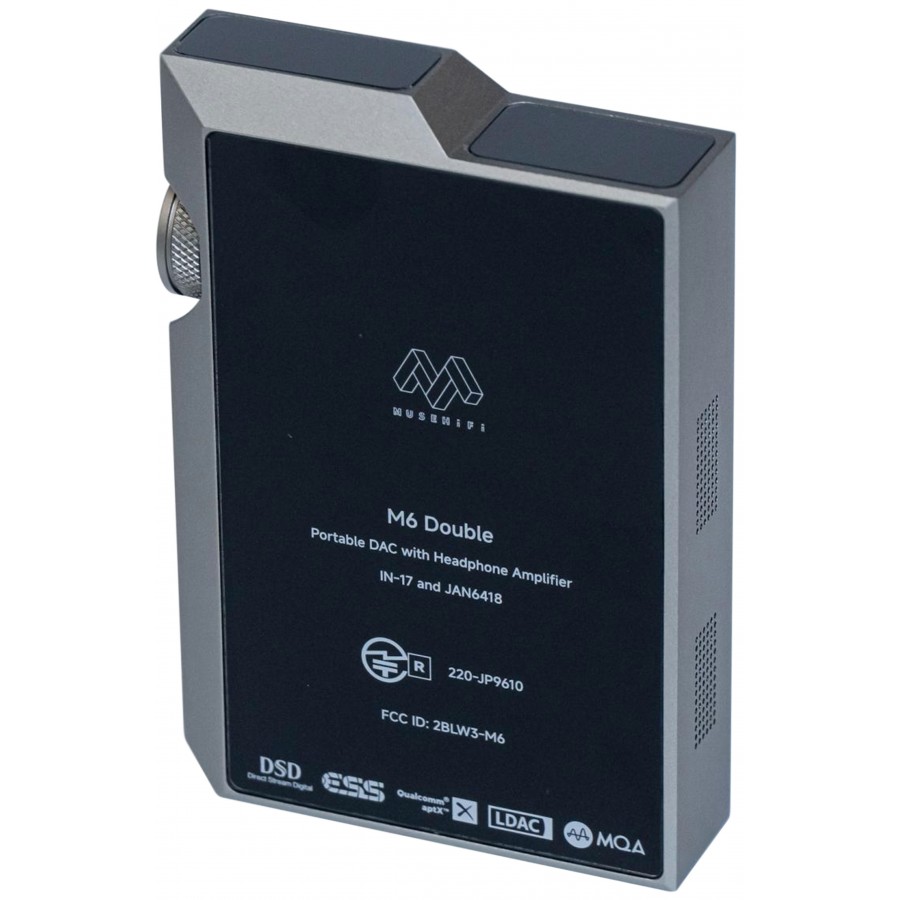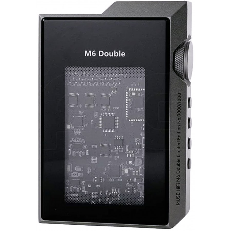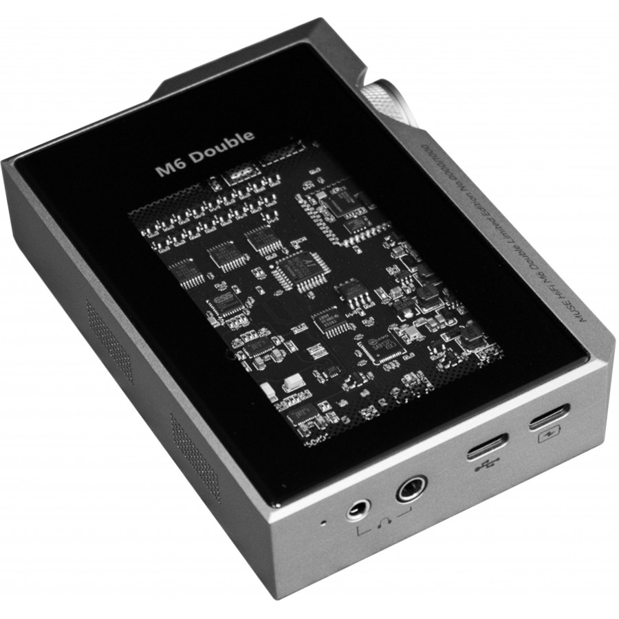 The Muse HiFi M6 Double is a portable DAC with a headphone amplifier designed for the conversion and amplification of high-resolution audio streams on the go. It features a custom ES9039 architecture compatible with 32bit 768kHz PCM and DSD512, combined with JAN6418 tubes, whilst a dual Accusilicon oscillator ensures low-jitter reclocking to stabilise signal reconstruction and preserve the temporal coherence of the processed stream.