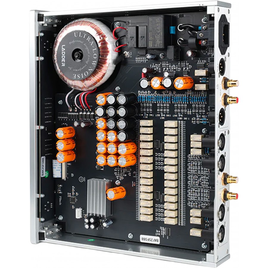 The LADDER Bach II is a preamplifier designed to bridge the gap between audio sources and power amplifiers. It features a discrete Class A balanced design combined with a 60-step relay-based volume control. Designed for versatile Hi-Fi integration, it offers both single-ended RCA and balanced XLR connectors for input and output. In addition, it features a linear power supply with a toroidal transformer, ensuring electrical stability that results in a clear and well-defined sound.