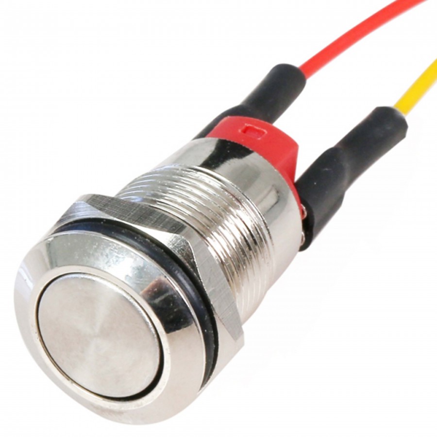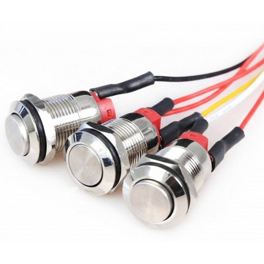 This Tinysine button kit works with the brand's amplifier and DSP modules. They are used to control audio volume +, volume -, play/pause. This kit includes 3 waterproof stainless steel buttons for panel mounting. The buttons have a diameter of 12 mm. All 3 buttons are momentary switches. The wires are 50cm long.