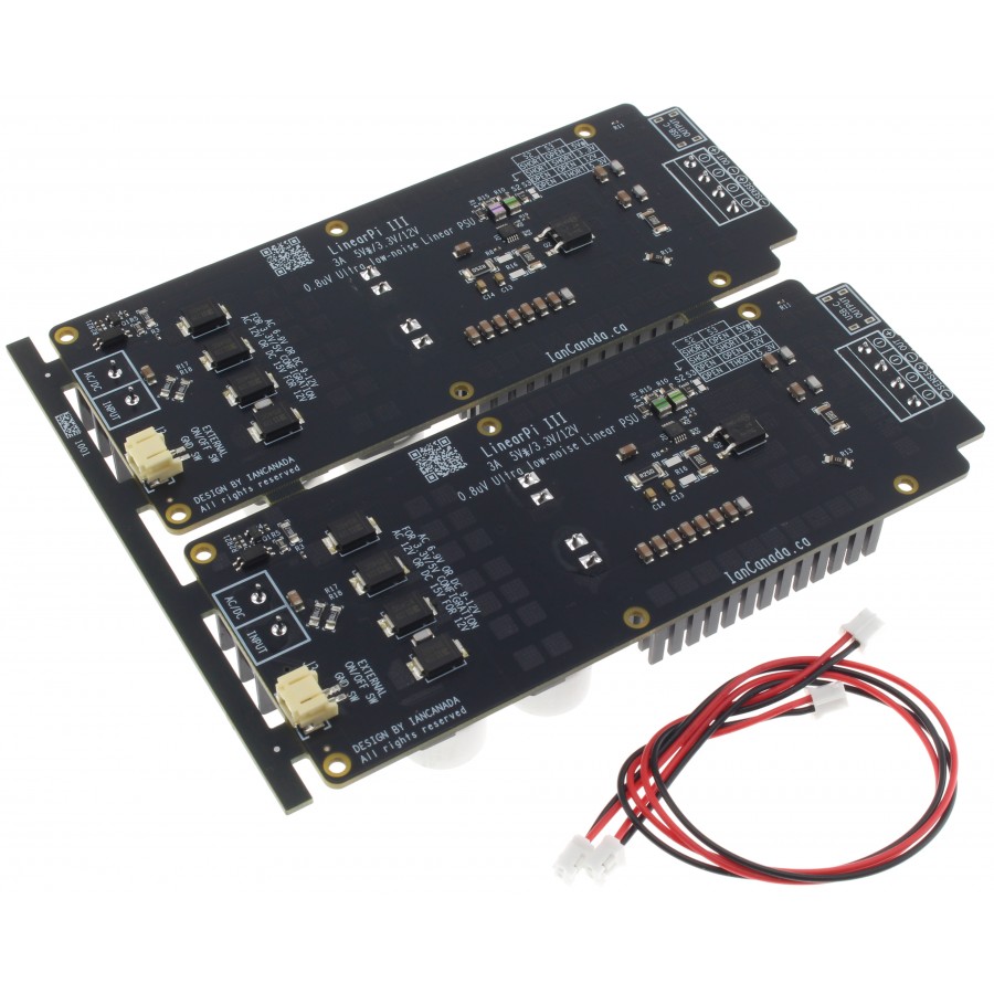 The Ian Canada Linear Pi Dual MKIII is an ultra-low noise linear power supply module delivering high-quality, high-current power that is both versatile and scalable. It is one of the best linear power supplies for Raspberry Pi or any other digital audio application, offering a noise level of only 0.8µV. Multiple LinearPi modules can be combined to create a larger power supply system. This module can also be easily upgraded to a supercapacitor power supply by combining it with the IanCanada UcConditioner.