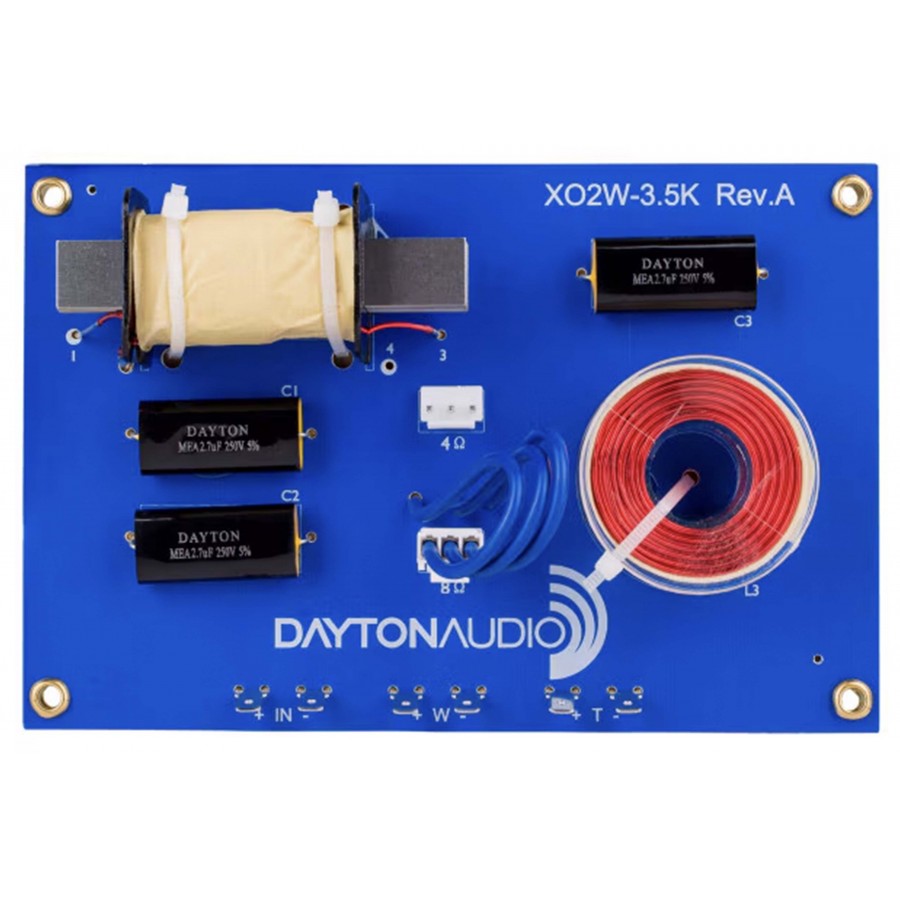The Dayton Audio XO2W-3.5K speaker crossover filter was designed using a second-order Linkwitz-Riley alignment (12dB/octave). Dayton Audio metallized polyester film capacitors are used in the high-pass and low-pass sections. 18-gauge inductors were used to keep DC resistance to a minimum. A unique feature of the low-pass section allows the use of 4 or 8-ohm woofers, which is perfect for building D'Appolito-type 2-way or multi-woofer systems. The high-pass cutoff frequency is calibrated for an 8-ohm load. All components are glued or secured to eliminate buzzing and vibration. The high-quality blue PC board uses a backplate for rigidity and eyelets for easy mounting. The power handling capacity of this filter is 300W.