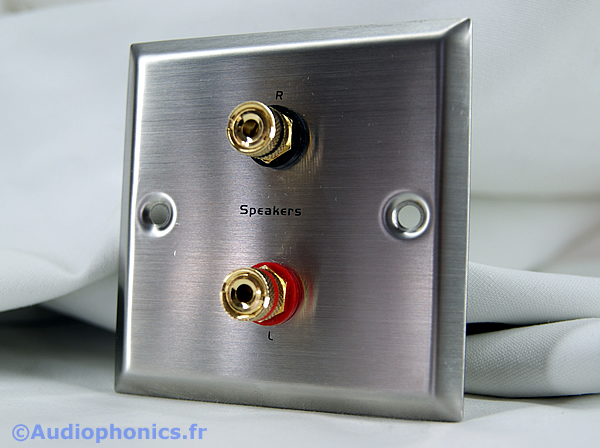 Brushed stainless steel plate with matte finish to be embedded in a wall with 2 mounting screws provided. Equipped with a pair of 24k gold plated HP terminals compatible with large section cables and banana plugs. Color-coded and silk-screened identification of left and right channels.