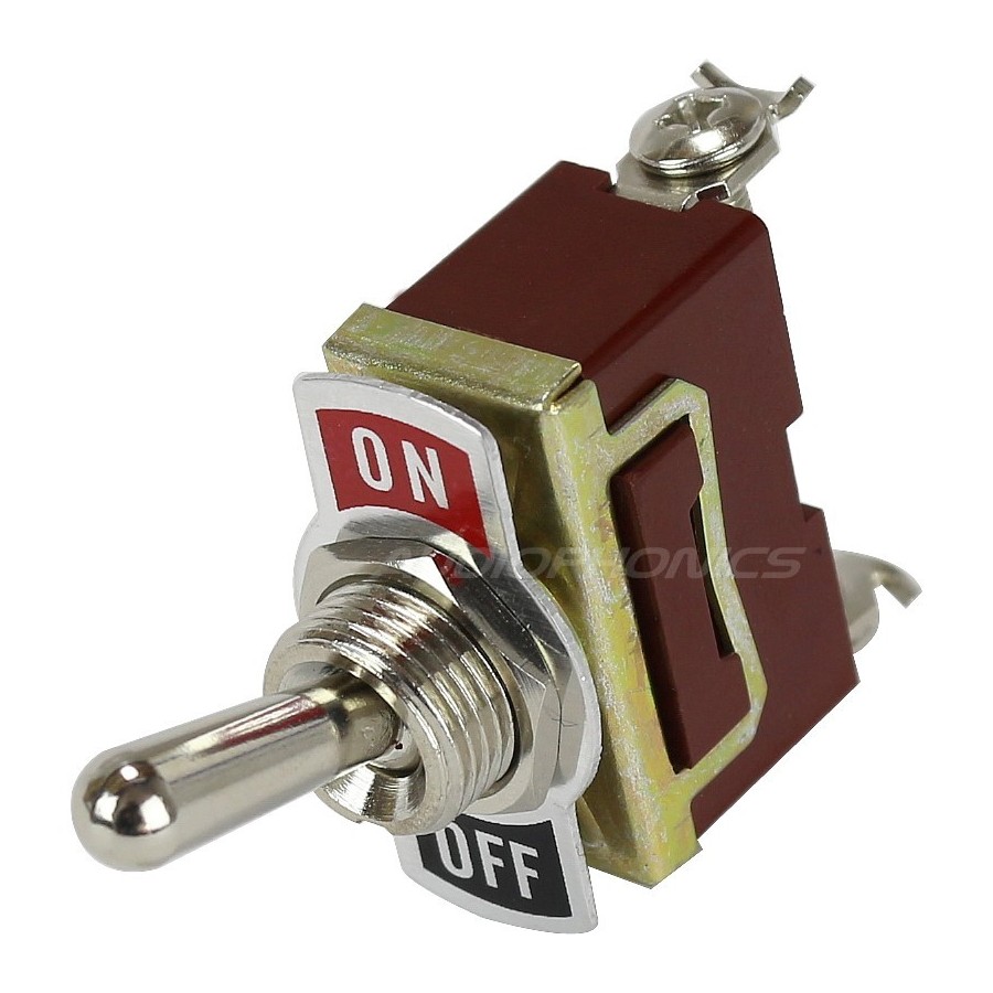 Boîtier noir, interrupteur métal avec inscription bascule ON-OFF.