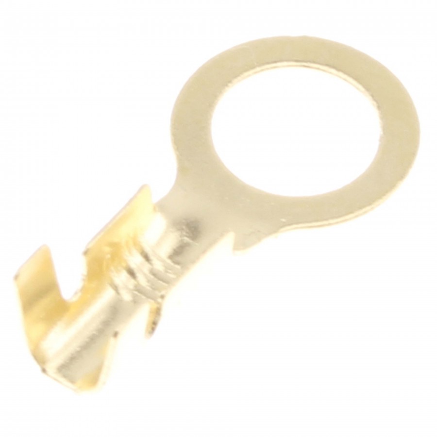 This set of 10 ring crimp terminals consists of gold-plated Ø5mm eyelet terminals that accept cables with a diameter of Ø6mm. They have a total length of 16mm.