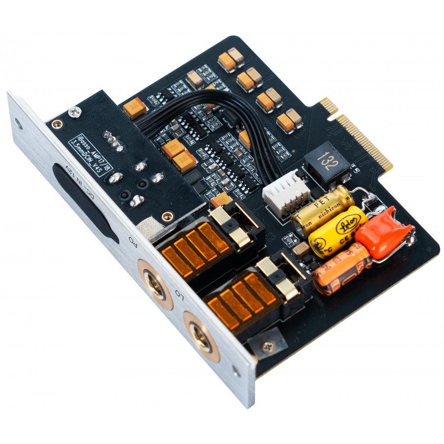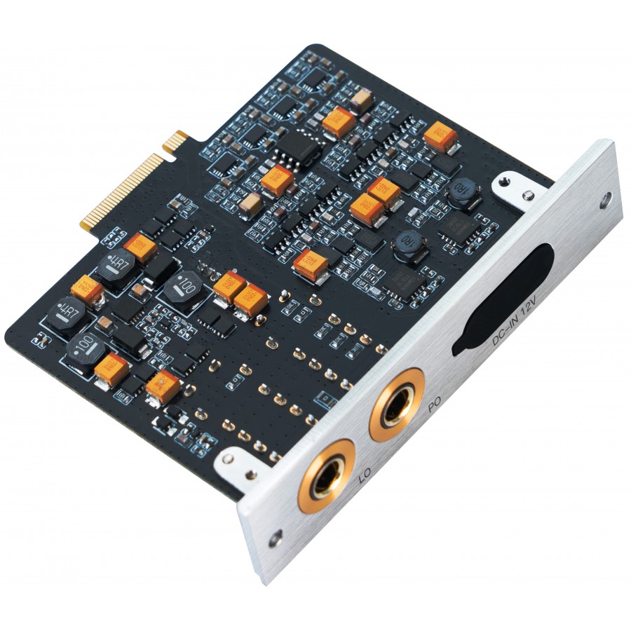 Le module d’amplification AMP17 adopte une topologie basée sur des transistors GaNFET, dont la résistance interne sensiblement plus faible que celle des MOSFET traditionnels autorise le passage de courants plus élevés sans compression prématurée. Cette caractéristique, prolongée par l’architecture basse impédance propre au module, se traduit par une capacité à maintenir une dynamique stable et étendue en sortie, y compris face à des casques à très faible impédance dont les appels de courant sont instantanés et exigeants. Au-delà de la puissance brute, cette approche garantit une restitution plus réactive, avec une tenue du grave et une articulation transitoire préservées même à volume soutenu.