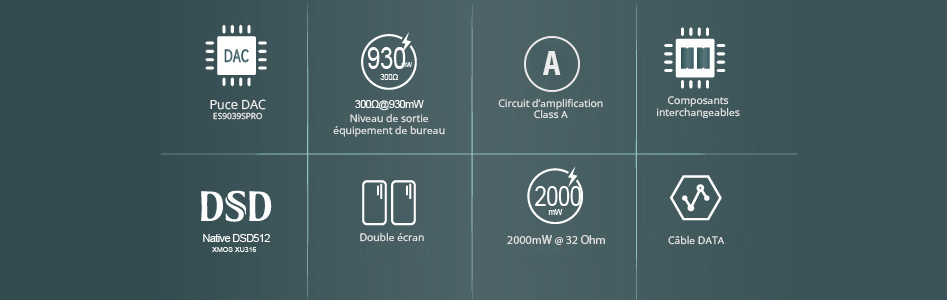| Sortie | 1* Sortie casque asymétrique Jack 3.5mm 1* Sortie casque symétrique Jack 4.4mm 1* Sortie ligne asymétrique 2V Jack 3.5mm (également entrée AUX) 1* Sortie ligne symétrique 4V Jack 4.4mm (également entrée symétrique Jack 4.4mm) |