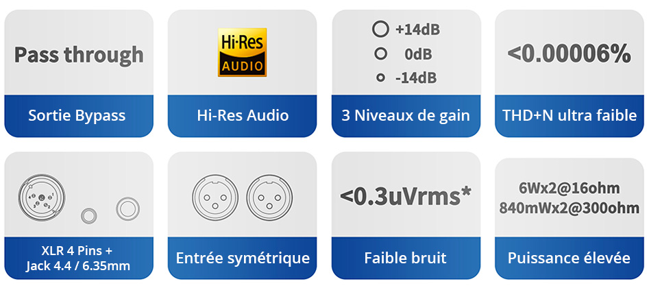 Le A30 Pro profite du nouveau circuit NFCA optimisé permettant d'atteindre d'incroyables performances en asymétrique. Les 10 AOP OPA1656 montés en parallèle et la technologie UHGF (Ultra High Gain Feedback) assurent d'excellentes caractéristiques AC et DC. Le courant élevé du Topping A30 Pro lui permet d'accompagner sans mal de nombreux modèles de casques. Ses caractéristiques mesurées tels qu'un ultra faible bruit de seulement 0.3µV ou une plage dynamique de 145dB permettent au Topping A30 Pro d'offrir une restitution sonore riche, précise et vivante.