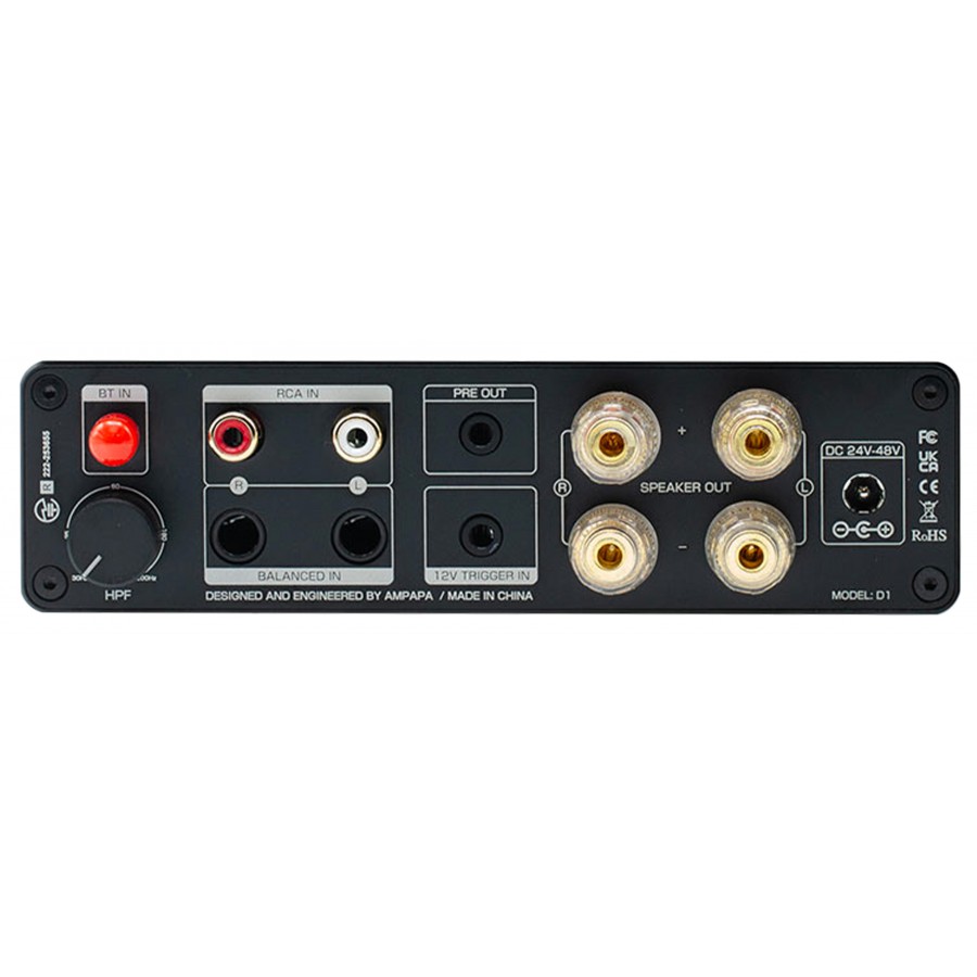La connectique s'inscrit dans une logique fonctionnelle grâce à ses deux sorties enceintes et sa sortie pre-out permettant une intégration facile à un système 2.1. De plus, son entrée RCA asymétrique, son entrée TRS symétrique et sa réception Bluetooth 5.2 autorisent la connexion simultanée de plusieurs sources. De son côté l'entrée trigger 12V permet la mise sous tension synchronisée avec d'autres éléments du système. Le filtre passe-haut permet d'avoir un contrôle sur des fréquences basses allant de 30 à 200Hz.