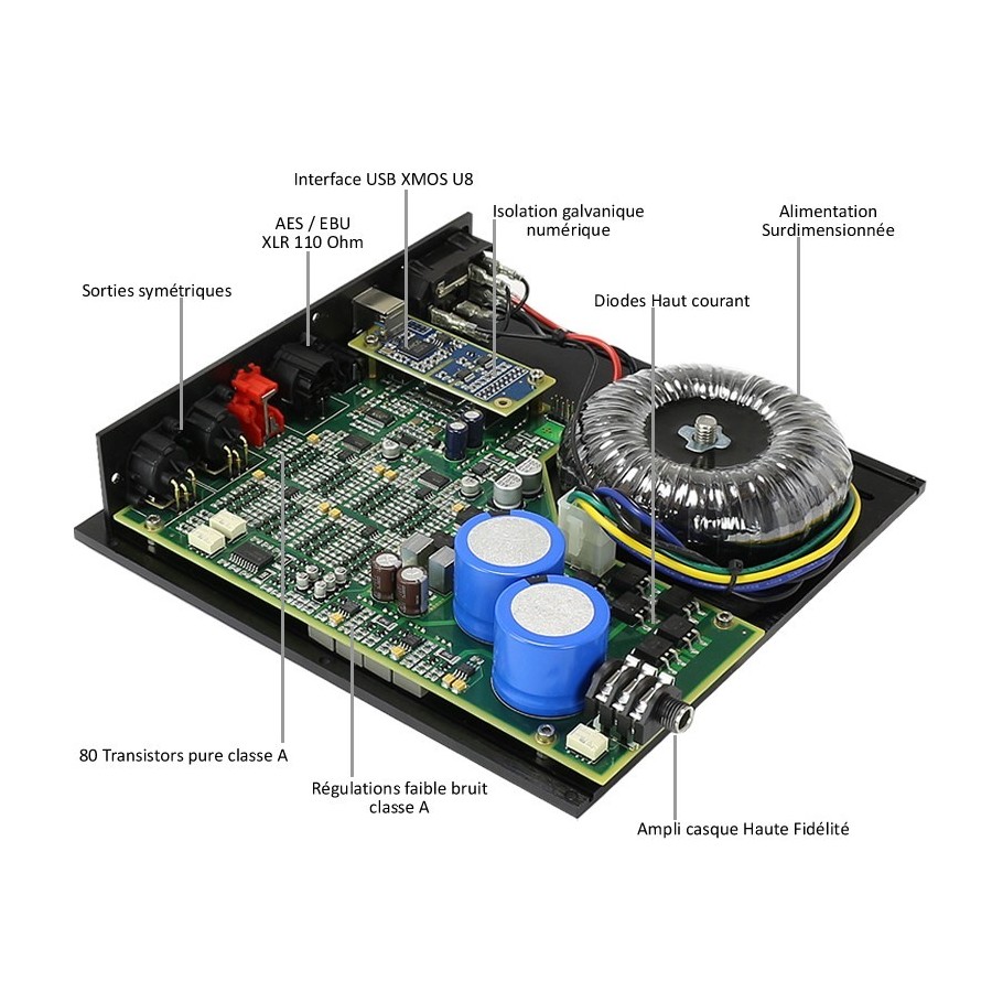Le son est ainsi naturel, sans crispation, avec une véritable qualité de timbre, aux antipodes d'un son froid grâce à ses alimentations en pure classe A.La conversion double mono utilisant 2 DAC 24 bit 192khz et DSD64 d'origine AKM offre une haute résolution et un préamplificateur numérique Haute Définition, même à bas volume.