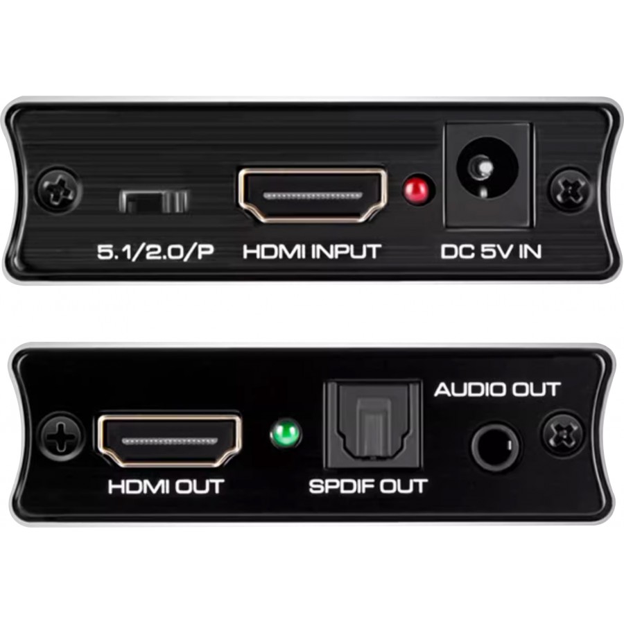 Cet extracteur permet de récupérer et extraire un signal HDMI en entrée pour ensuite sortir à la fois en HDMI, Optique Toslink et Jack 3.5mm afin de pouvoir distribuer le signal audio indépendamment. L'extracteur est compatible avec les technologies 4K, HDR, 3D avec une bande passante de 18Gbps. Un sélecteur permet lui de choisir le nombre de canaux, pour un fonctionnement en stéréo, 5.1 ou pass-through. De la même manière, un switch permet d'activer ou non la fonction ARC