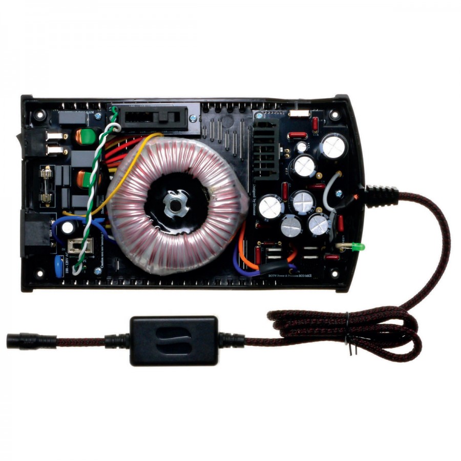 Avec l'alimentation linéaire régulée SBooster BOTW P&P ECO MKII, la purification du signal électrique commence immédiatement là où le courant pollué entre dans l'alimentation. Le filtre secteur à deux étages et la self de terre éliminent la pollution électrique à haute fréquence avant que le courant n'atteigne le transformateur. Ce dernier, de qualité audio, est fabriqué sur mesure et doté d'un blindage électrostatique et magnétique.