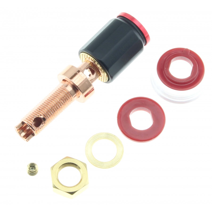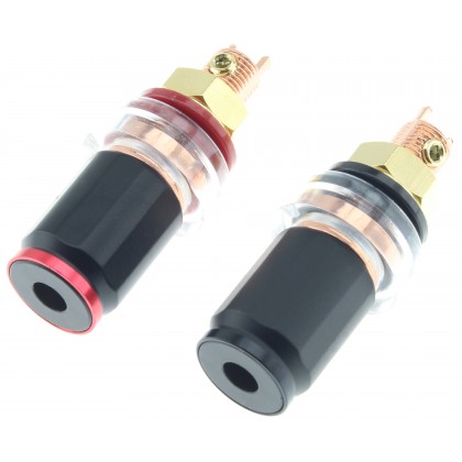 Ces borniers haut-parleurs de la marque Flagship Kimbers bénéficient d'une conception avec des matériaux de qualité. Leurs contacts sont en cuivre pur tandis que l'écrou de serrage est en laiton et leur corps en acier noir. L'ensemble offre un bornier HP robuste et à haute conductivité. Par ailleurs, leur esthétique offre une singularité appréciable pour quiconque souhaite des borniers originaux et différenciants. Ils acceptent les fiches banane, les fils nus ainsi que les fourches 8mm.