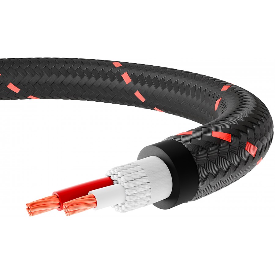Afin d'assurer la protection du conducteur, celui-ci est isolé avec plusieurs couches alliant PVC et feuilles de coton tandis que l'isolation externe est constituée d'une âme PVC et d'une gaine textile tressée garantissant la préservation du signal et sa stabilité. Les fiches sont quant à elles identifiées avec des flèches pour faciliter l'installation.