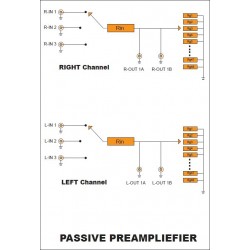 Cet atténuateur passif utilise une résistance de précision qui est montée en parallèle avec un commutateur mécanique à résistance CMS 1%. Cette résistance est reliée au potentiomètre, qui en fonction de sa position connecte plus ou moins la sortie à la masse, et fait ainsi varier le volume.
