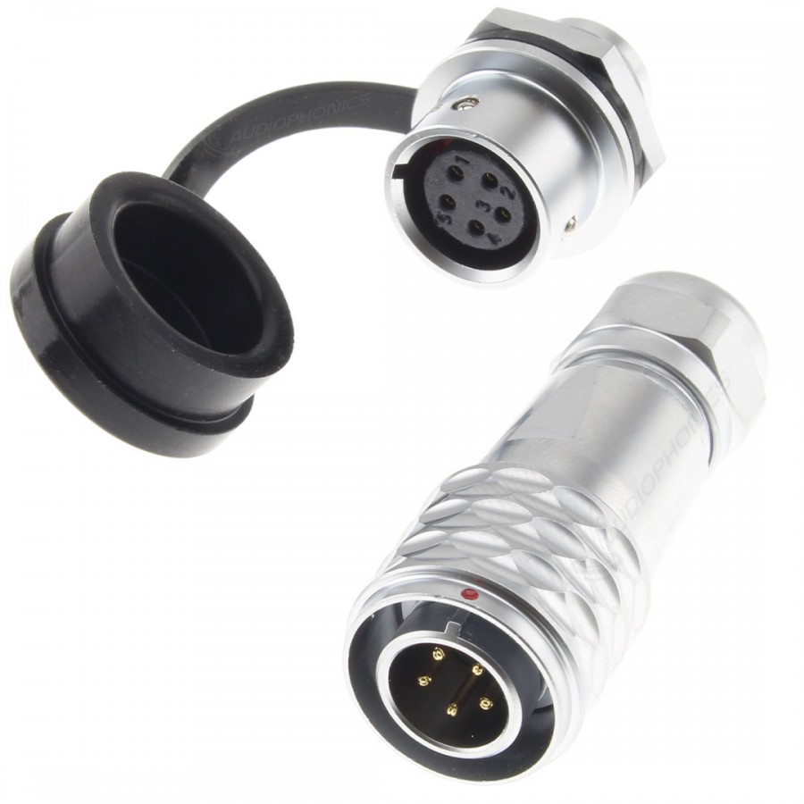 Ce produit est composé d'un connecteur SF12 mâle 5 pôles ainsi que de son embase femelle 5 pôles également. De grande qualité, ces connecteurs sont dotés de contacts plaqués or pour une conductivité accrue et une résistance à la corrosion et à l'oxydation. Leur corps est fait de laiton chromé et intègre une isolation PPS résistante jusqu'à une température de 260°C.