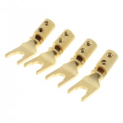 Cette fourche robuste est faite de cuivre et est plaquée or 24k, ce qui lui permet une forte conductivité et une résistance à la corrosion et à l'oxydation. Elle se dote d'un système de verrouillage par vis et accepte des câbles d'un diamètre allant jusqu'à Ø4mm.