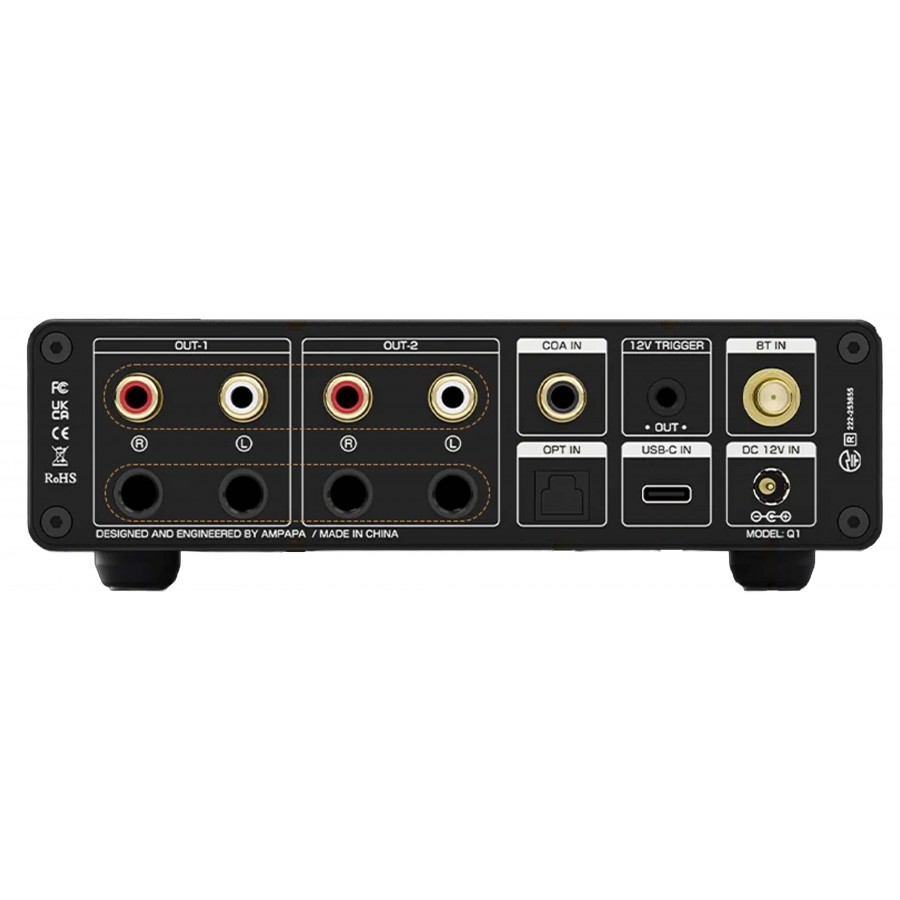 | Conditionnement | 1x Ampapa Q1 1x Antenne Bluetooth 1x Câble USB-A/C vers USB-C 1x Câble optique Toslink 1x Câble trigger jack 3.5mm 1x Télécommande IR 1x Alimentation 12V DC |