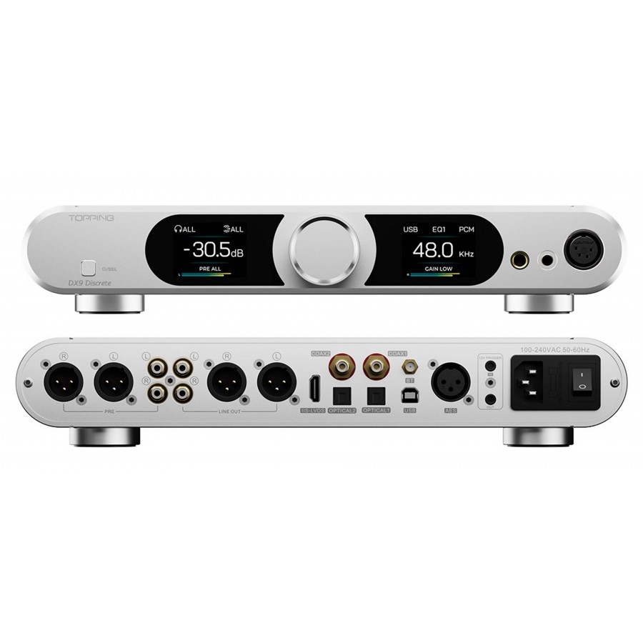 Le Topping DX9 Discrete est un DAC R2R /amplificateur casque aux performances encore supérieures à celles de son prédécesseur, le DX9, qui reposait sur la technologie AKM. En effet, le DX9 Discrete s’appuie cette fois sur un circuit PSRM symétrique de 16 éléments par canal, combiné à des réseaux de résistances R2R, ainsi que sur une puce de réception optique AK4118 et une interface USB XMOS XU-316. Il prend en charge des taux d’échantillonnage haute résolution jusqu’au PCM 32bit 768kHz et au DSD512. Le circuit est complété par un CPLD Altera MAX II, une horloge haute précision, un contrôle de volume par relais ainsi qu’un circuit d’amplification NFCA à six canaux, garantissant des performances et une puissance inégalées.