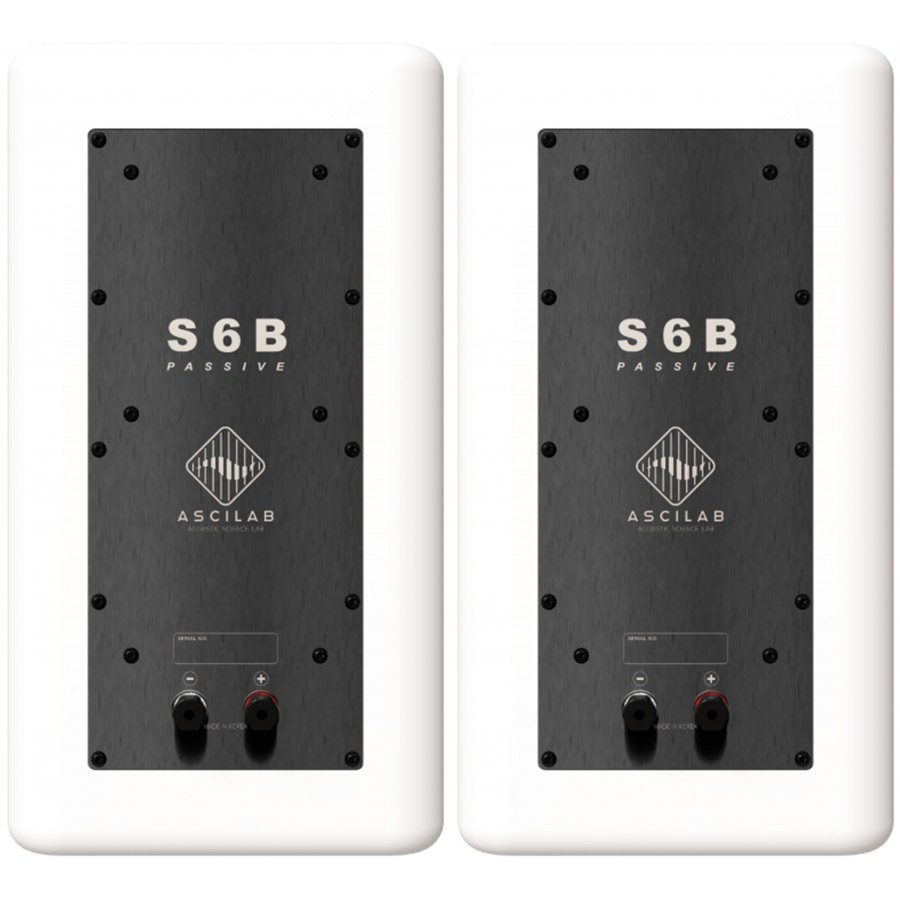 Les enceintes AsciLab S6B disposent de deux radiateurs de 8" passifs positionnés de chaque coté. Ceux-ci permettent de limiter les résonances indésirables tout en optimisant le rendu des basses fréquences. Cette solution contribue également à réduire la distorsion à fort volume, contrairement à un évent bass-reflex qui peut générer des turbulences. AsciLab a aussi fait le choix d’intégrer deux radiateurs passifs afin de conserver un design d’enceinte relativement compact.