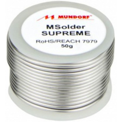 Le fil de soudure Mundorf Msolder SilverGold Supreme est composé à 9.5% d'argent et 0.1% d'or. Il est indiqué pour les projets de pointe nécessitant une conductivité supérieure (montage de tubes, assemblage de câbles, feuilles argent/or). Sa teneur en métaux précieux est équilibrée par une proportion de flux à 2.5% (2.2.3).