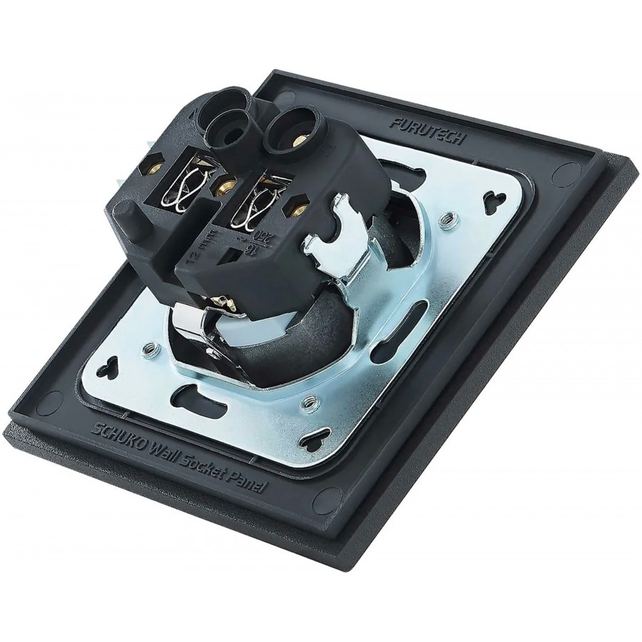 Au-delà de la structure, l’optimisation des supports internes renforce la rigidité globale, tandis que la nouvelle génération du système de plaque de pression Furutech augmente la surface de contact conducteur, réduisant l’impédance de jonction et sécurisant l’insertion. Dans le même mouvement, les conducteurs en cuivre α (Alpha) adoptent désormais un plaquage rhodium non magnétique, associé à un ressort en acier inoxydable non magnétique qui maintient une pression constante, garantissant ainsi une connexion stable et homogène sur le long terme, notamment avec des fiches Schuko soumises à des cycles répétés d’insertion.