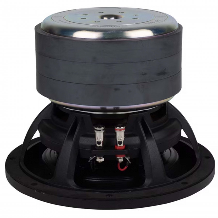 Le SS8-22 est animé par une bobine mobile de 2.5 pouces, utilisant quatre couches de cuivre, enroulées sur un support en aluminium. Cette configuration maximise le nombre de spires dans l’entrefer pour accroître la force magnétique tout en maintenant un écart réduit, gage de précision. Le support en aluminium agit comme dissipateur thermique et contribue à la stabilité lors d’utilisations prolongées. Associée à une ventilation importante à travers le sous-cône, la suspension, le pôle magnétique et l’entrefer, cette conception limite les contraintes thermiques et permet d’encaisser une puissance nominale de 500W RMS.