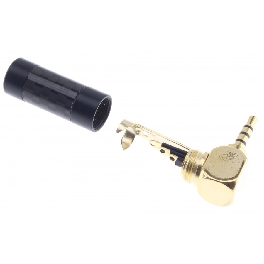 Ce connecteur Jack 2.5mm coudé TRRS mâle coudé bénéficie de contacts plaqués or 24k ainsi que d'un corps en fibre de carbone. Cela lui permet de résister à l'oxydation et à la corrosion tout en se protégeant également des interférences. Il accepte des câbles de Ø6mm ou moins et son montage s'effectue par soudure.