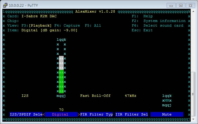 Le support du driver par le kernel Raspberry PI à partir de la version 4.19.34 permet une installation facilitée, et permet d'accéder au contrôle de volume Hardware, la gestion des filtres, et le choix de l'entrée (I2S/SPDIF).