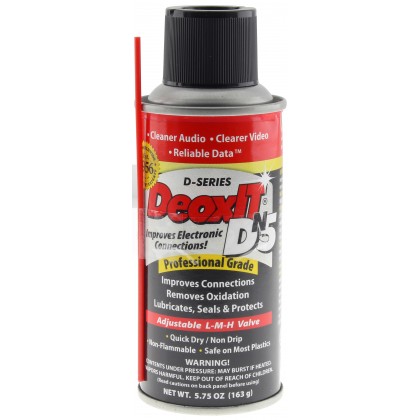Le DeoxIT DN5S-6N est un nettoyant pour contacts et connecteurs permettant également d'améliorer leur conductivité. Cette solution aérosol s'utilise sous forme de spray. Le DN5S-6N est doté de la paille Perfect Straw TM afin de vaporiser efficacement la solution. Ce spray élimine et limite par ailleurs l'oxydation des contacts en plus d'améliorer leur conductivité. Le CAIG DeoxIT DN5S-6N permet aussi de réduire les arcs électriques, les interférences radioélectriques, l'usure et l'abrasion pour obtenir une transmission du signal fiable et un son plus pur.
