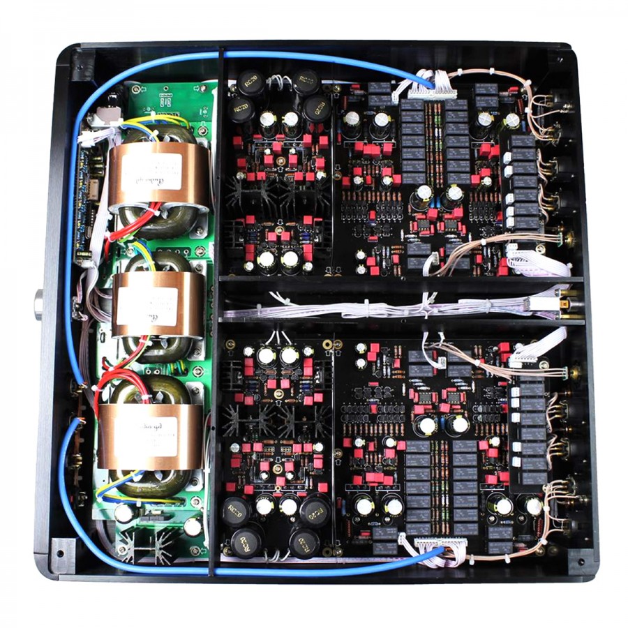 Ce préamplificateur / amplificateur casque dispose d'une conception totalement symétrique dont tous les composants ont été appairés à la main. L'alimentation des différentes éléments est assurée par pas moins de 8 groupes d'alimentations parallèles Class A.