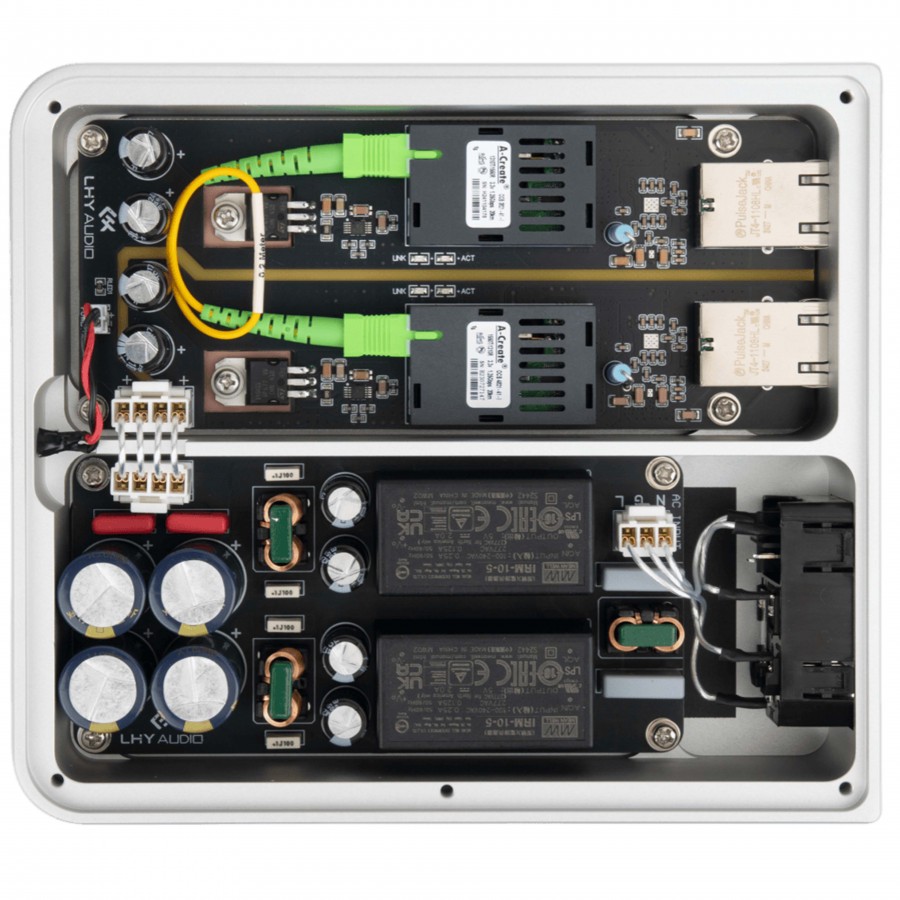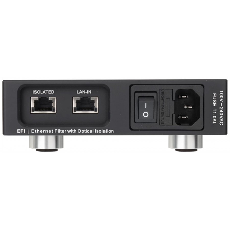 Le EFI de LHY Audio met en œuvre une isolation galvanique complète par conversion optique, transformant le signal Ethernet RJ45 en transmission par fibre optique avant reconversion vers le format cuivre en sortie. Cette rupture physique du chemin électrique élimine mécaniquement les boucles de masse entre source et destination, tandis que l'absence de continuité conductrice supprime le bruit de mode commun et les interférences électromagnétiques susceptibles de dégrader la temporalité du flux de données. L'architecture s'appuie sur une alimentation linéaire intégrant le régulateur ultra-faible bruit LT3042 en topologie PNP, garantissant une alimentation stable des circuits de conversion optique sans introduire de composante parasite haute fréquence.