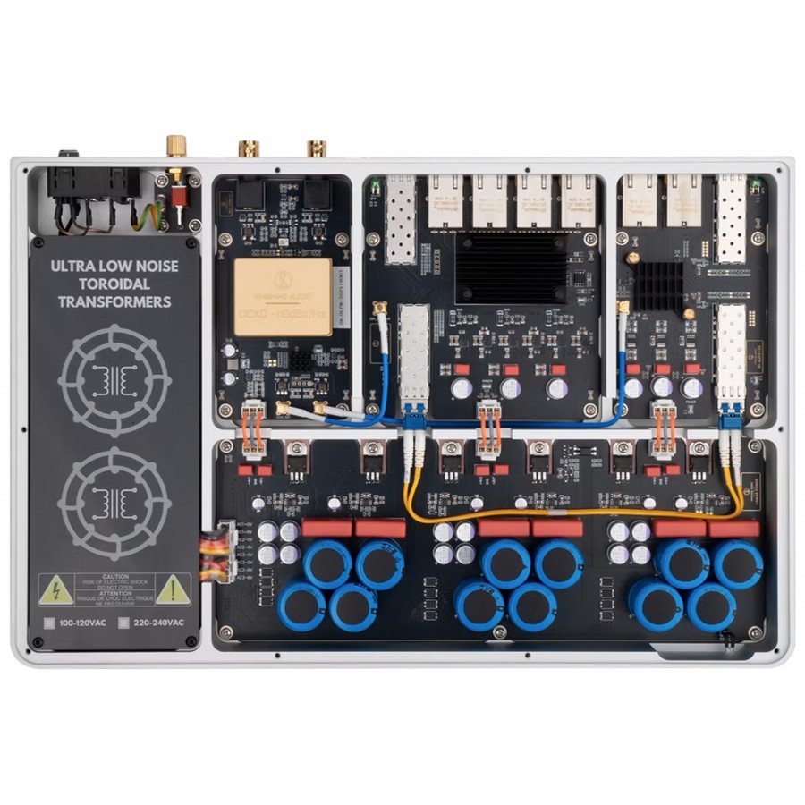 L’alimentation linéaire repose sur deux transformateurs toriques NORATEL, dédiés respectivement à la section d’horloge et au circuit réseau. Cette indépendance évite une fois encore les contaminations entre étages. Dix-huit régulateurs linéaires (LDO) assurent une distribution d’énergie à faible bruit sur l’ensemble des sous-circuits. Cette architecture minimise le bruit de fond et contribue à la réduction du jitter.
