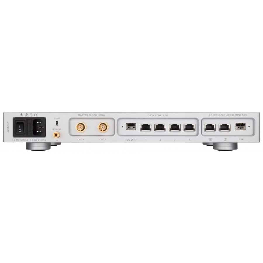 La section d’horloge principale utilise deux oscillateurs SC-CUT OCXO thermorégulés, affichant un bruit de phase inférieur à –110dBc/Hz. Ces oscillateurs sont associés à une boucle à phase asservie (PLL) qui garantit leur stabilité à long terme et leur synchronisation précise avec les sections réseau 2.5G et 1.0G. Le SW10 PRO dispose en outre de deux sorties BNC 10MHz / 50Ω, permettant la synchronisation externe d’un DAC ou d’un streamer, et lui donnant le rôle d'horloge maître au sein d'une installation Hi-fi.