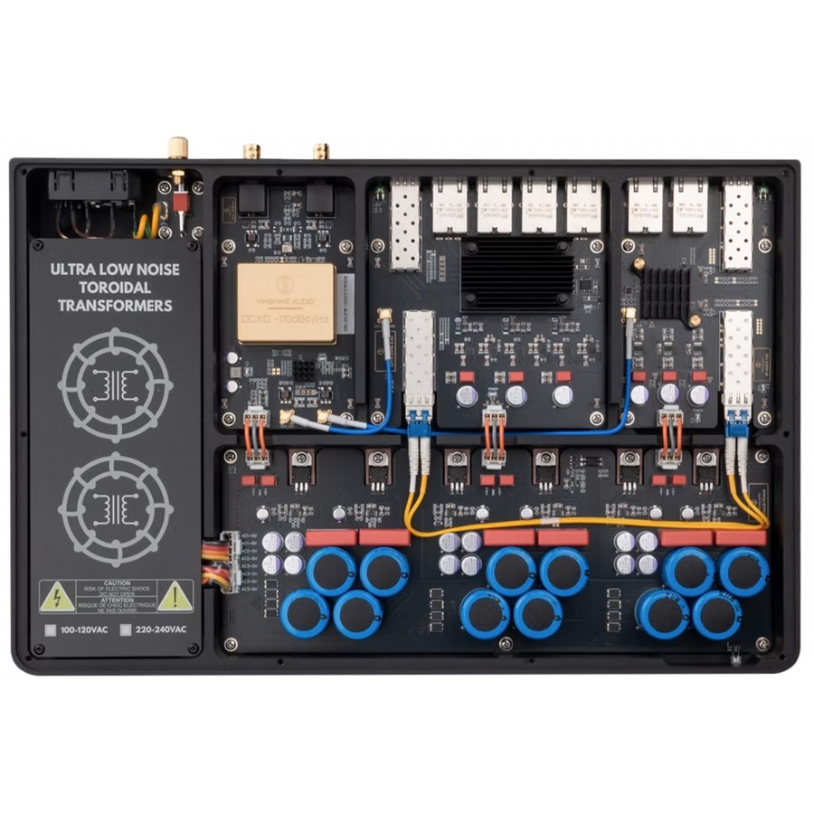 L’alimentation linéaire repose sur deux transformateurs toriques NORATEL, dédiés respectivement à la section d’horloge et au circuit réseau. Cette indépendance évite une fois encore les contaminations entre étages. Dix-huit régulateurs linéaires (LDO) assurent une distribution d’énergie à faible bruit sur l’ensemble des sous-circuits. Cette architecture minimise le bruit de fond et contribue à la réduction du jitter.